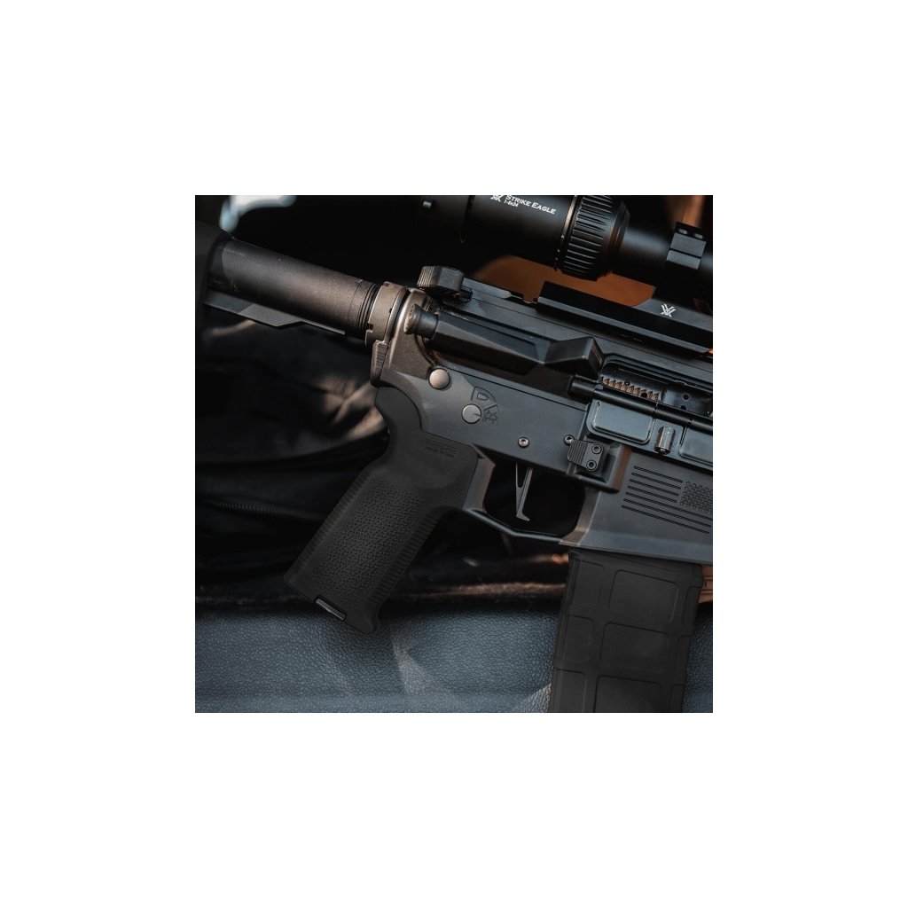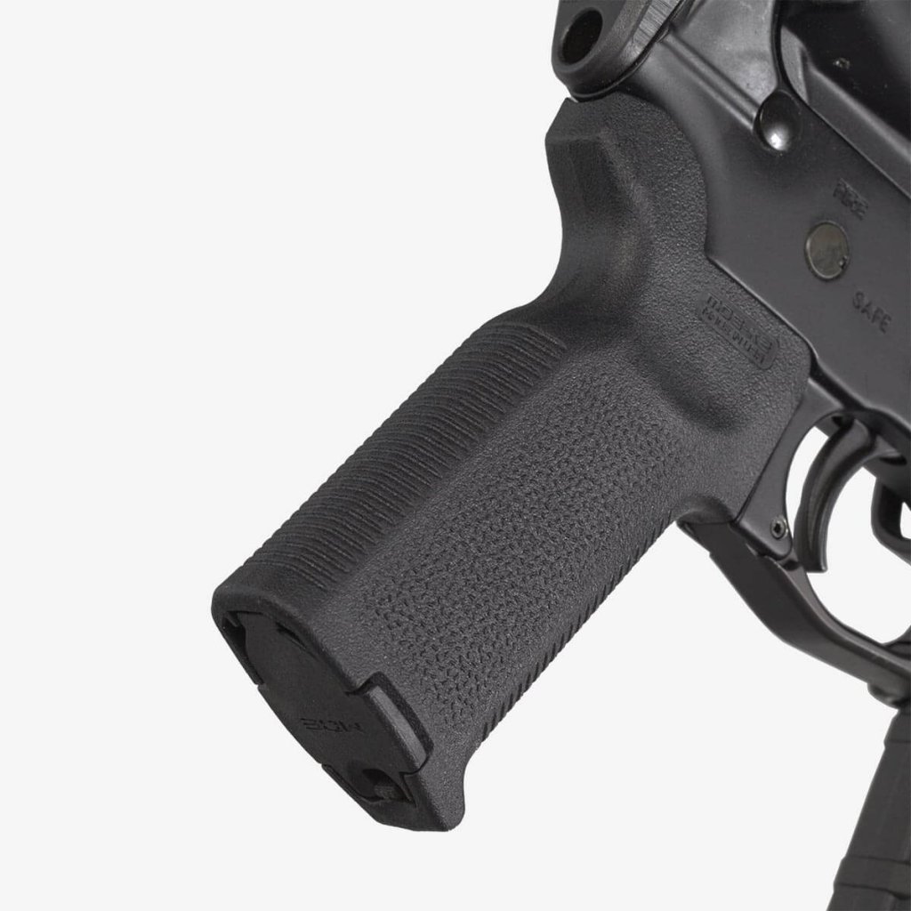 The MOE-K2 Grip offers a full-size profile in a comfortable grip for shooters who want more grip surface. Designed for PDWs or firearms with short length of pull, the more-vertical grip angle enhances handling and control when the firing hand is pulled tightly against the body. Provides internal storage capacity and accepts standard Magpul Storage Cores (sold separately).