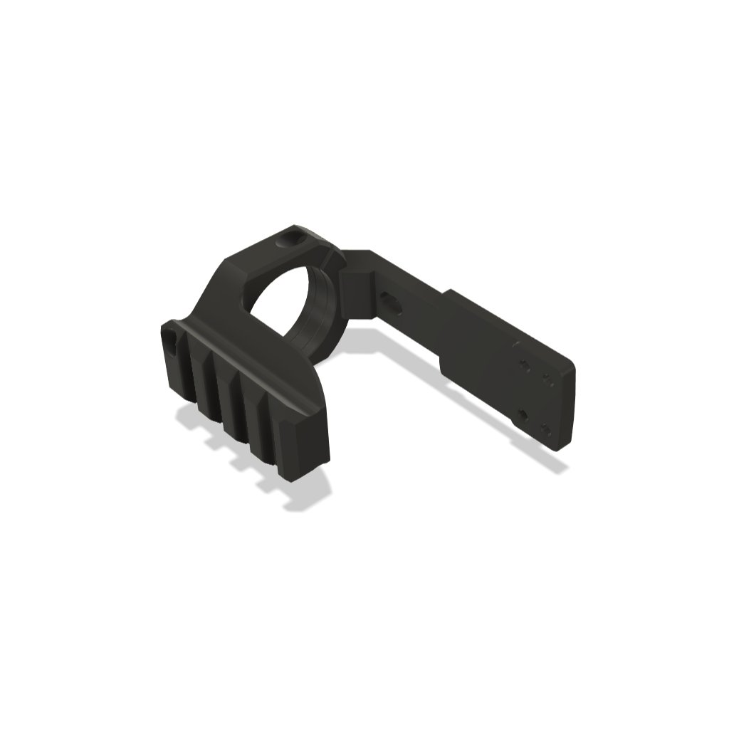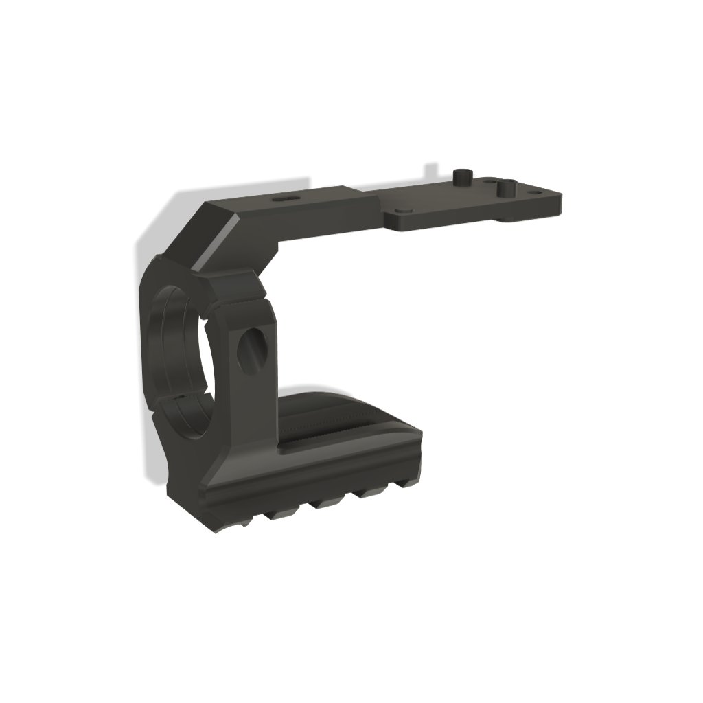 Thanks to this mount, the original clamp-on silencer can be used and the stock can be folded down after a minor adjustment (bending the stock wire or slightly grinding the hole; applies to Holosun HS407K X2 and HS507K X2).
